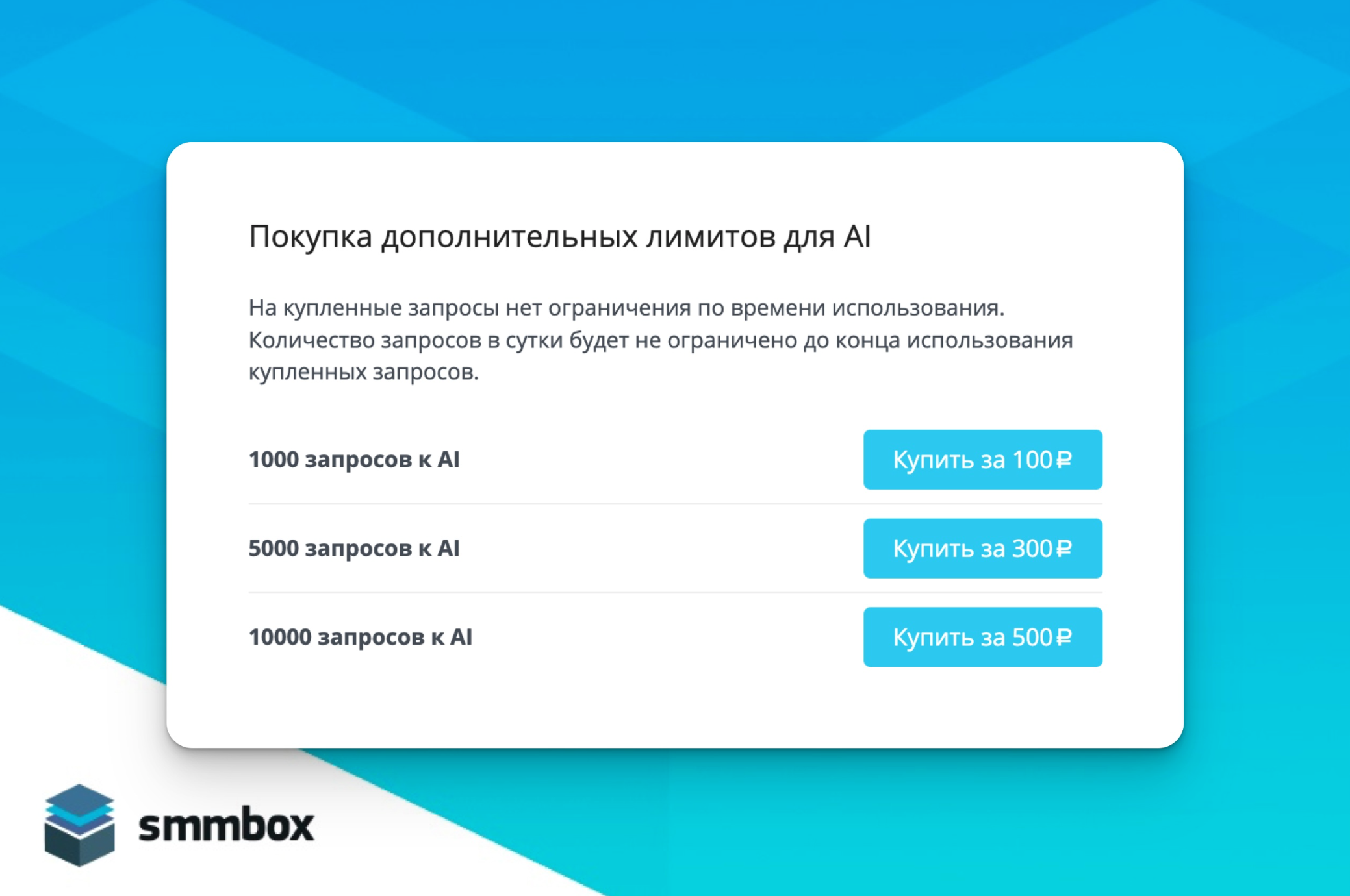 Снизили цены на покупку запросов к нейросети.Было:1000 за 200₽2000 за 350₽3000 за 500₽Стало:1000 за 100₽5000 за 300₽10000 за 500₽